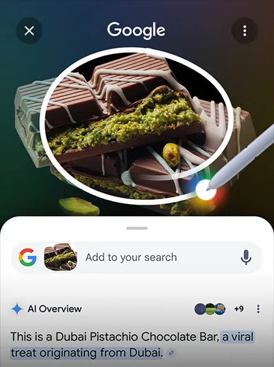 Circle to Search with Google allows you to search anything on your screen and get information faster with AI Overviews. Just circle an object—including images, videos, or text—with your finger or S Pen and you'll get results immediately. You can even search for a song that you hear in the moment without switching apps.11