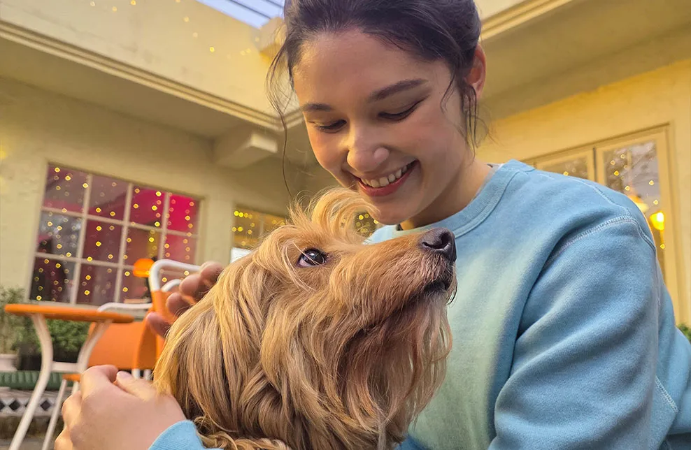 Footage is shot of a woman and her dog outside in the evening. The dog runs towards the woman and the footage is clear thanks to Galaxy S25 Ultra's camera.